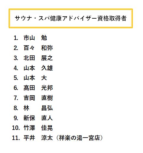 【温泉NEWS】「サウナ・スパ健康アドバイザー」 認定資格取得 最終更新日:2021年3月1日 月 この度、エオネックスグループの11名が「サウナ・スパ健康アドバイザー」 認定資格を取得致しました。 この資格は、サウナやスパに関する正しい知識を身につけ、お客様や自身の健康増進に活用されることを目指しております。 エオネックグループでは今後も積極的に温浴に関する幅広い知識を習得していきます♪